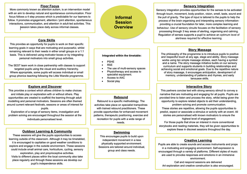 Our vision is that in every Informal classroom you will see a process based approach enriched by exploration and play. That each and every pupil will have control over the pace and nature of their own learning, facilitated by an experienced and ambitious staff team who understand the importance of providing repetition and offering variation in enabling learners to form new connections. We aim to challenge pupils to become as independent as possible. We aim for our pupils to form positive connections with staff, and through these positive connections we hope that pupils will continue to develop their preferred methods of communication- taking real ownership of their journey.