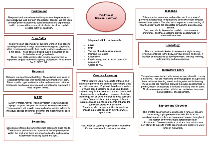 Pupil profiles document the personal approach needed to ensure engagement. Pupil profiles are updated as and when needed and are formally reviewed termly. Profiles are displayed in the classrooms; accessible to all practitioners. Profiles enable us to adapt the learning environment according to need. They should be reviewed in collaboration with the whole class team- taking into account reports and suggestions from other professionals such as SALT, SEST and Physiotherapy.