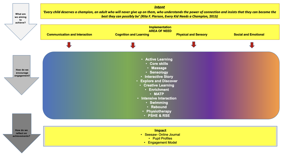 We recognise the importance of a broad and balanced curriculum and appreciate that this will look different for each pupil. Although the curriculum is based around the four areas of need-Communication and Interaction, Cognition and Learning, Physical and Sensory and Social and Emotional we adopt a cross curricular approach throughout the school day.